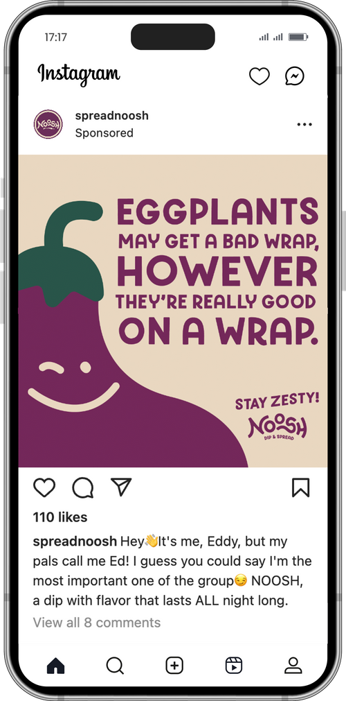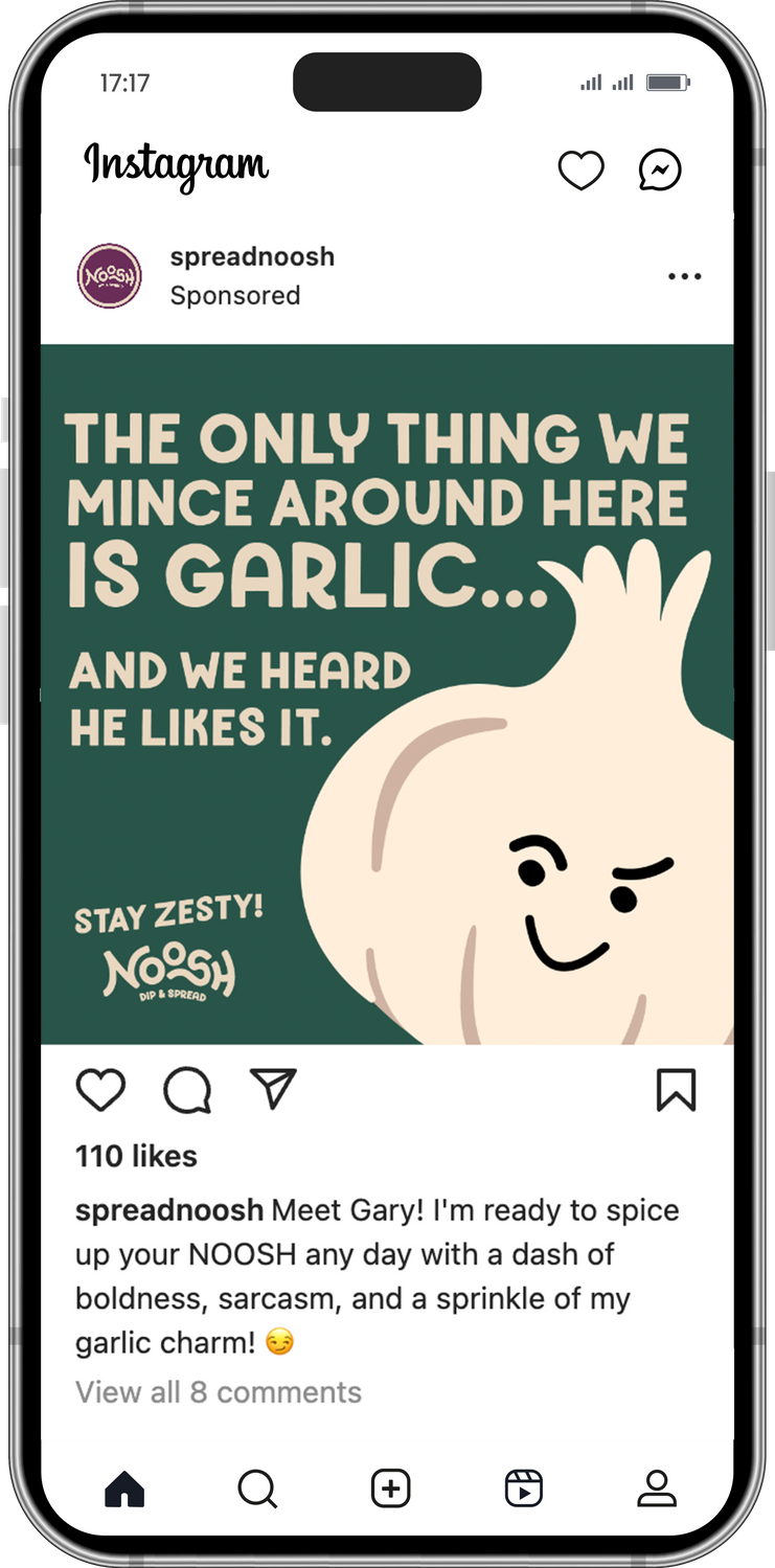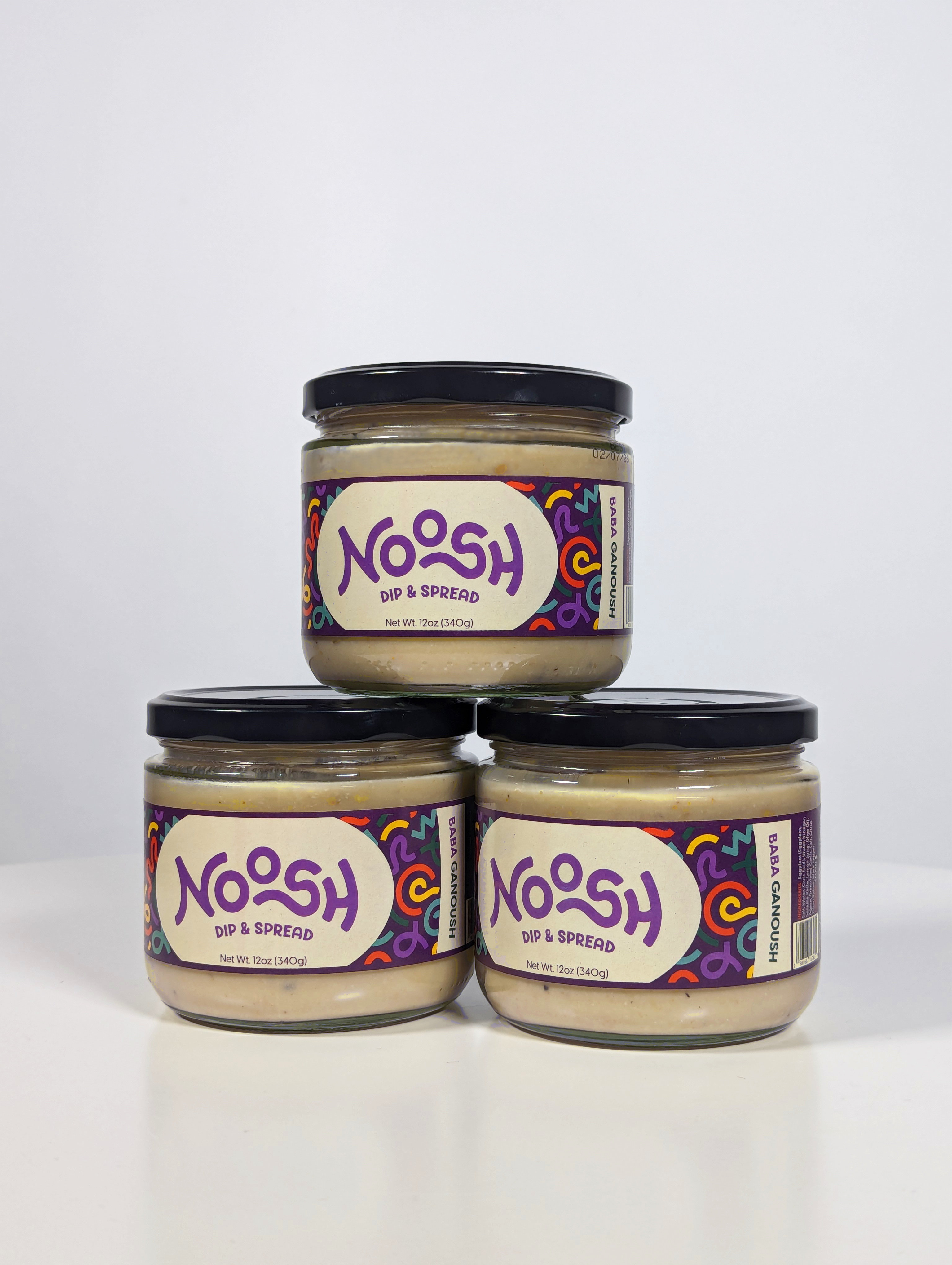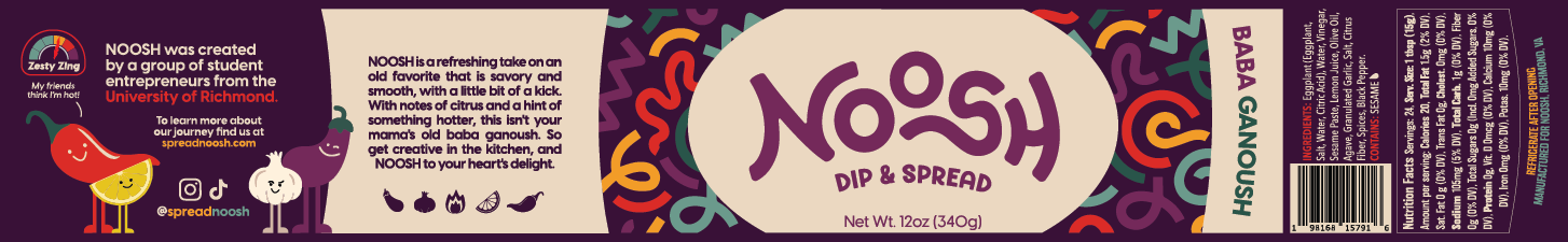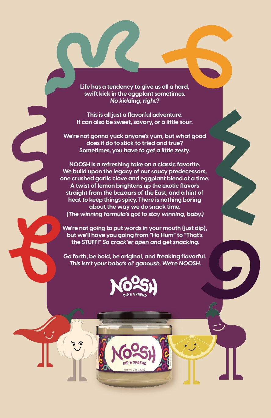 The four characters represent the four main ingredients in NOOSH: eggplant, lemon, garlic, and pepper.