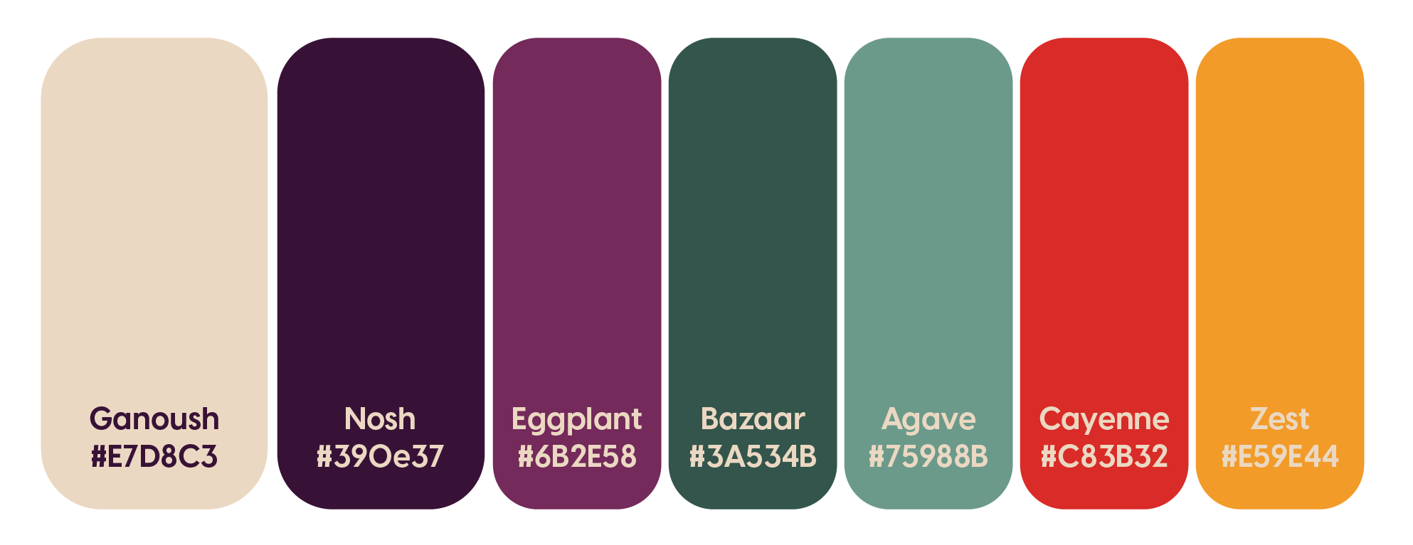We stuck with a bright color palette to match the bold flavors of the dip itself, and the color names are derivative from the ingredients or anything associated with the region that Baba Ganoush originated from.