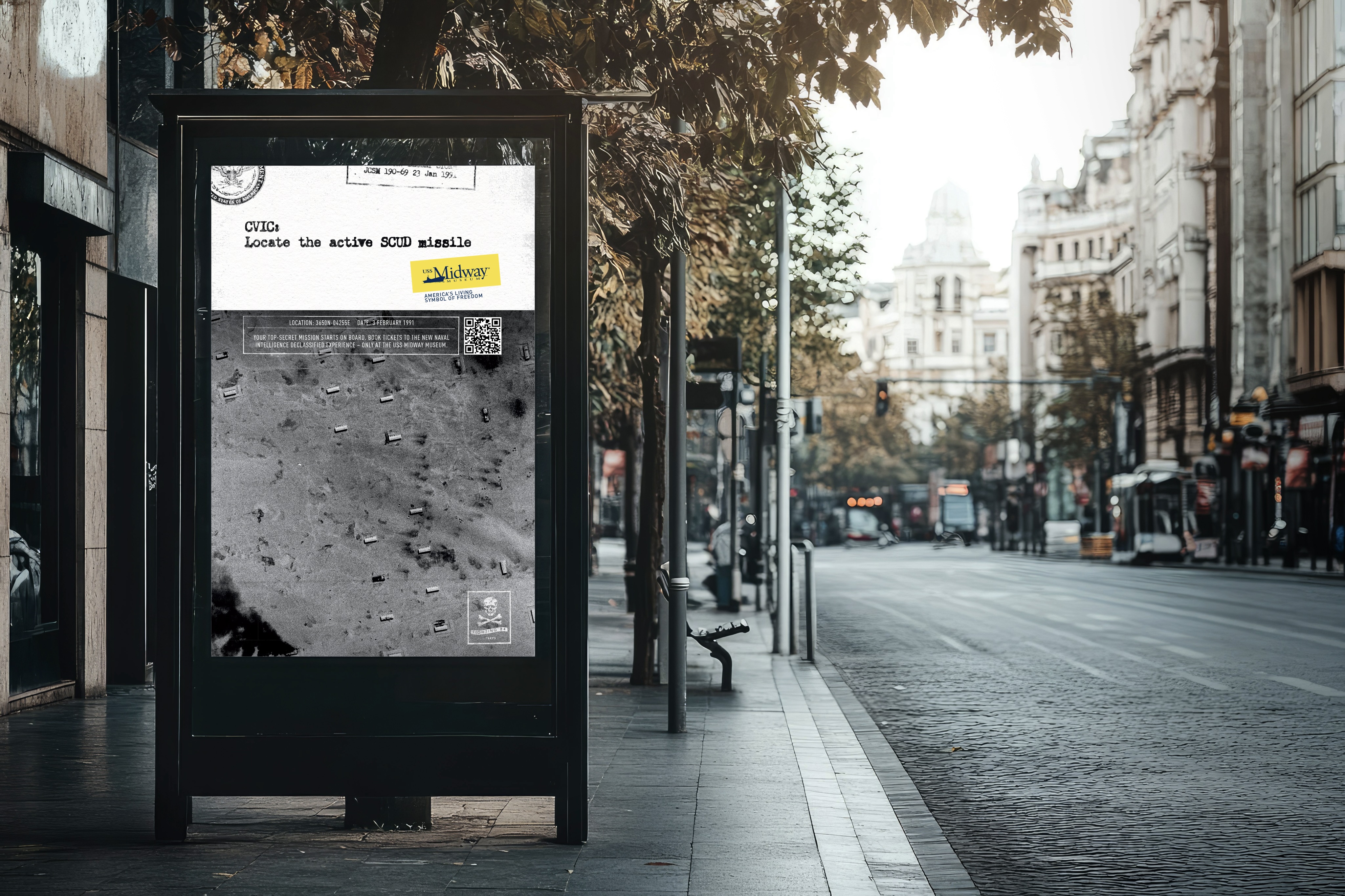 Vague out-of-home posters with a grainy design, a simple call to action, and where the mission would start.
